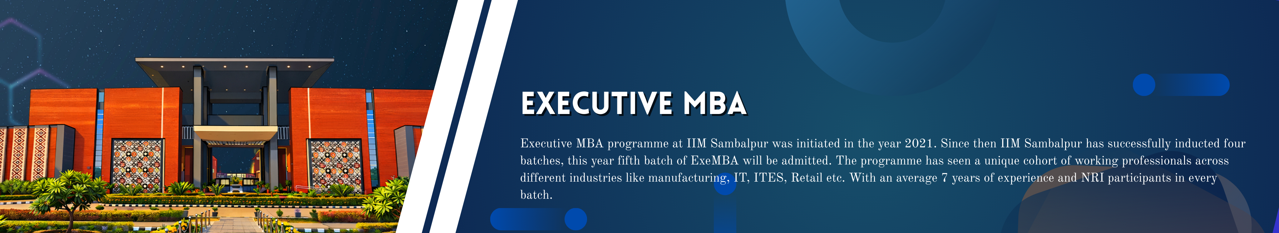 Executive MBA programme is designed to capture the dimension of futuristic organizations with an immersive and active learning experience to equip future leaders. The program will benefit those having strong entrepreneurial mindset and leverage upon various GoI initiatives like Atamanirbhar Bharat, Make in India and Start-up India. The entire spectrum of program will cover emerging global trends, international interface, align with government eco-system and transform opportunities into actions. The program shall emphasis more on responsible leadership, sustainability, and digital transformation.. Executive MBA programme at IIM Sambalpur was initiated in the year 2021. Since then IIM Sambalpur has successfully inducted four batches, this year fifth batch of ExeMBA will be admitted. The programme has seen a unique cohort of working professionals across different industries like manufacturing, IT, ITES, Retail etc. With an average 7 years of experience and NRI participants in every batch.